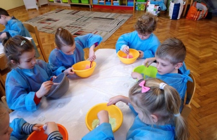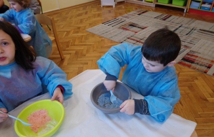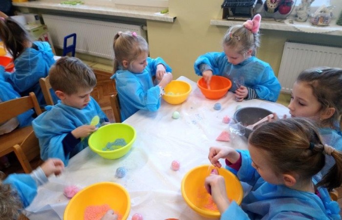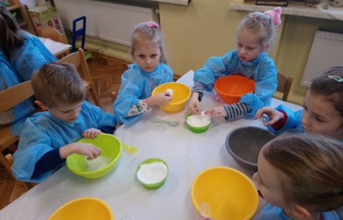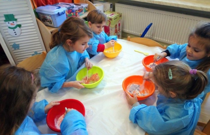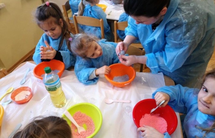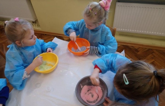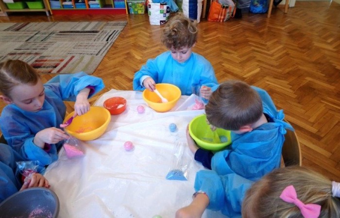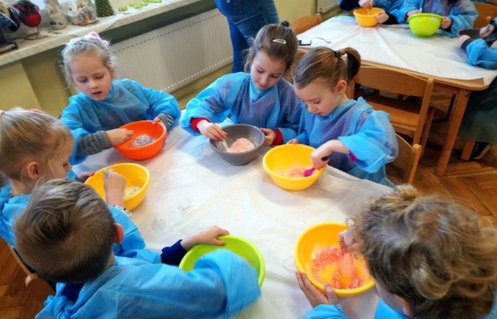 Najpierw każdy w miseczce musiał wymieszać sodę, kwasek cytrynowy, olejek zapachowy i barwnik. Następnie dodaliśmy trochę oleju i z takiej pachnącej soli w foremce wykonaliśmy musującą kulę do kąpieli. Kulę i pozostałą sól zabraliśmy do domu.