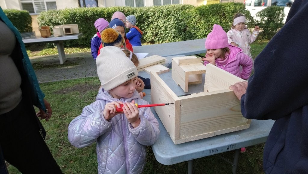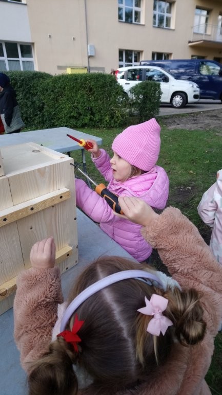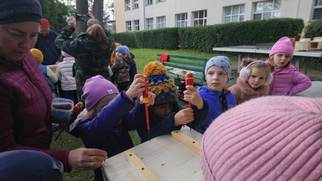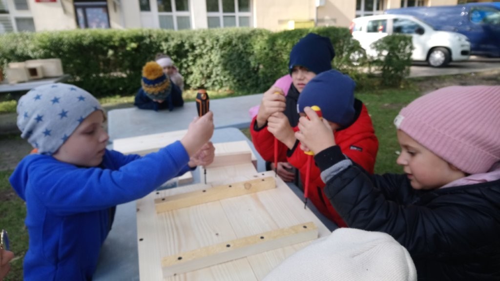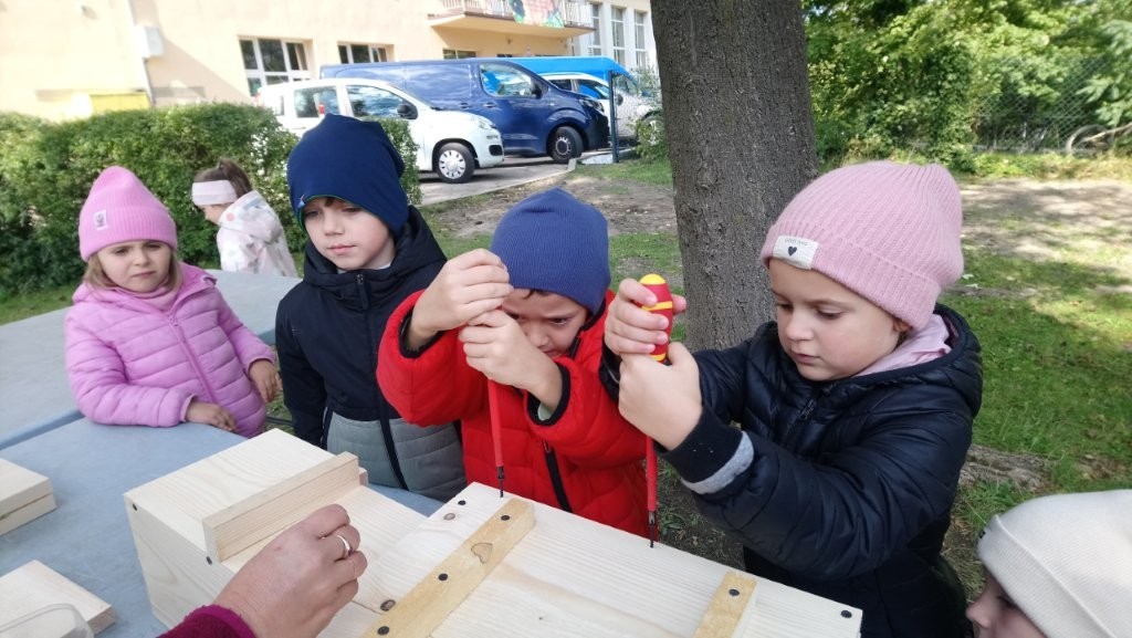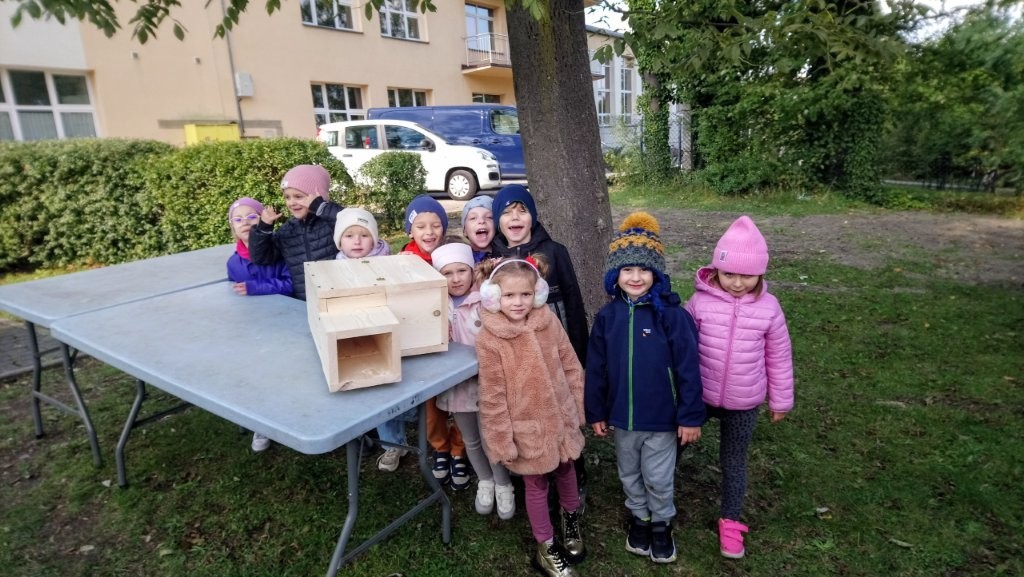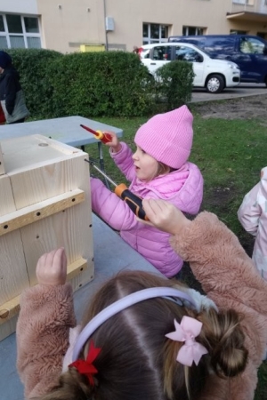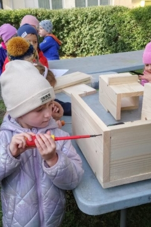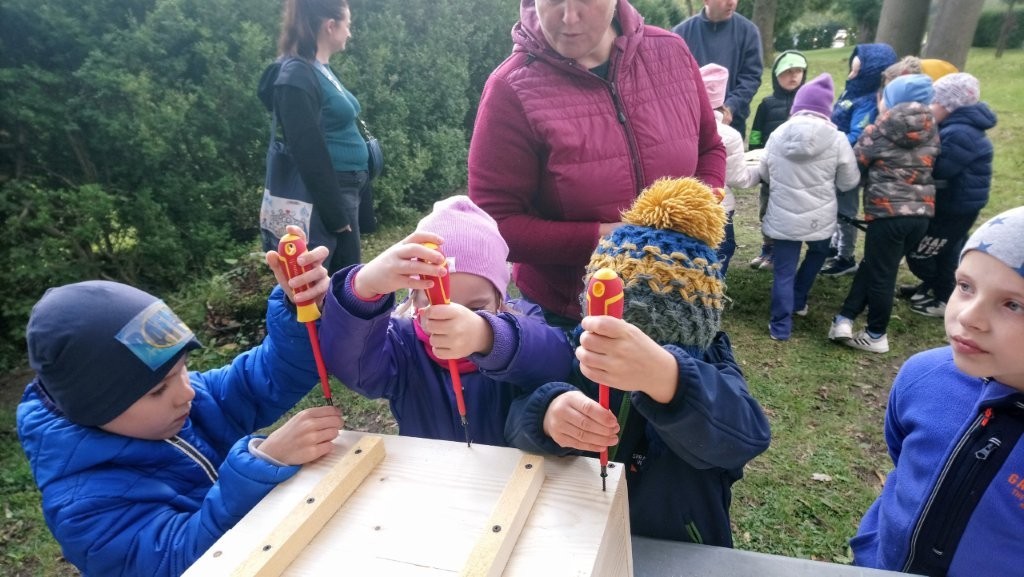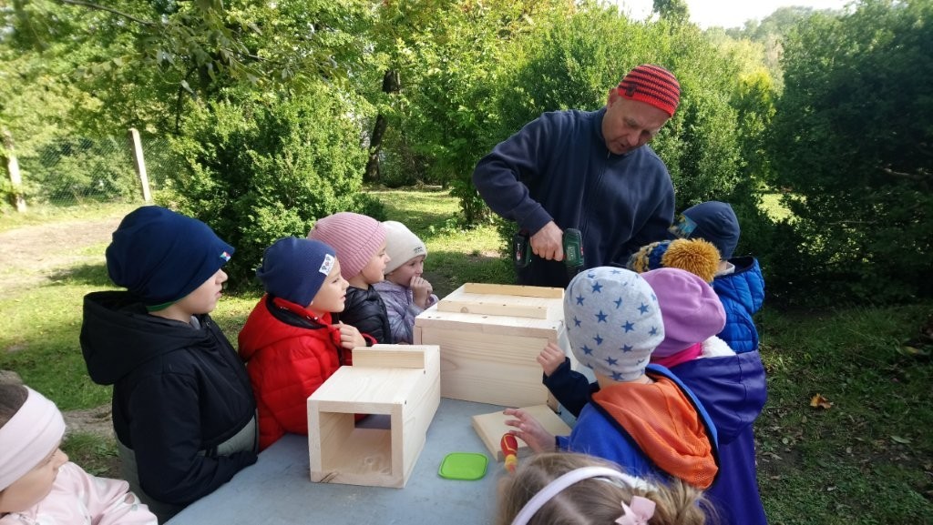 Następnie przystąpiły do działania. Pod okiem i z pomocą pana Jarka grupa Misiów wykonała domek dla jeża. Wszystkie dzieci z wielkim zaangażowaniem skręcały kolejne ściany jeżowego domku. Wszyscy pracowali i na gotowy efekt wspólnej pracy nie trzeba było długo czekać . Pan Jarek ukryje w lesie nasz domek w którym chętnie zamieszka sympatyczny jeż.