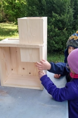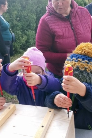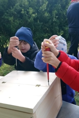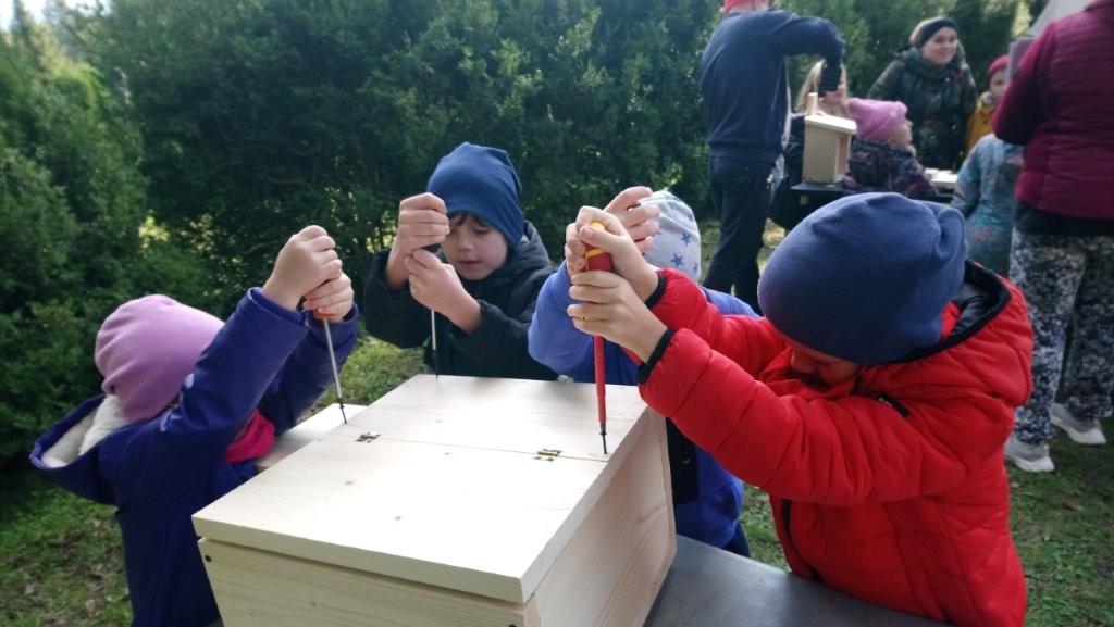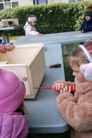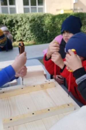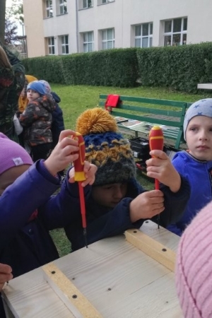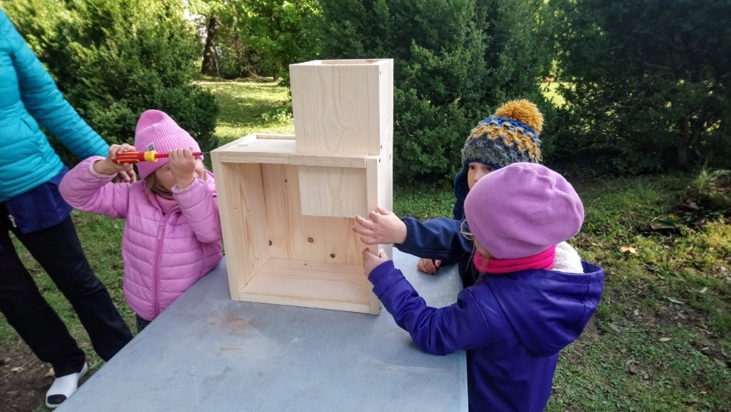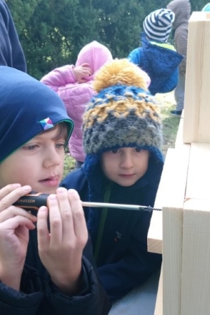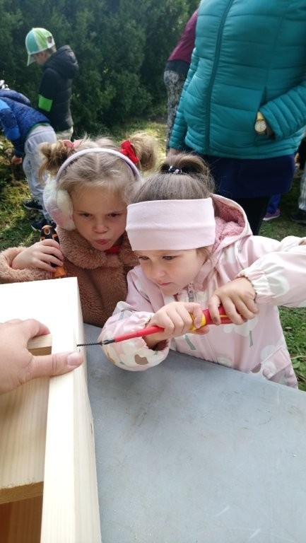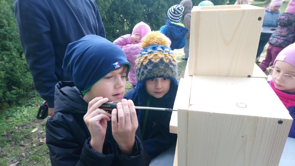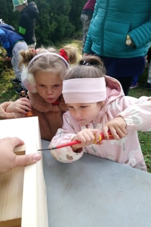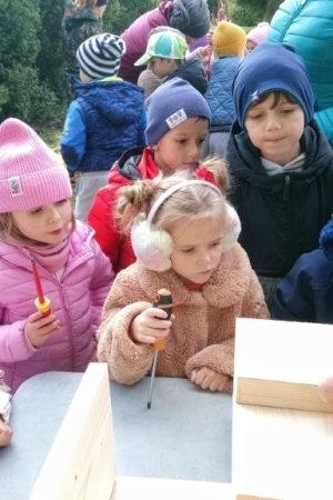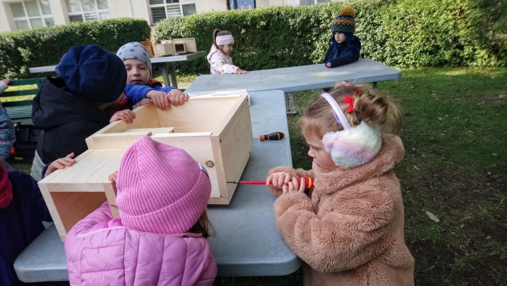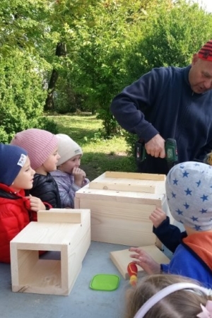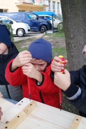 Następnie przystąpiły do działania. Pod okiem i z pomocą pana Jarka grupa Misiów wykonała domek dla jeża. Wszystkie dzieci z wielkim zaangażowaniem skręcały kolejne ściany jeżowego domku. Wszyscy pracowali i na gotowy efekt wspólnej pracy nie trzeba było długo czekać . Pan Jarek ukryje w lesie nasz domek w którym chętnie zamieszka sympatyczny jeż.