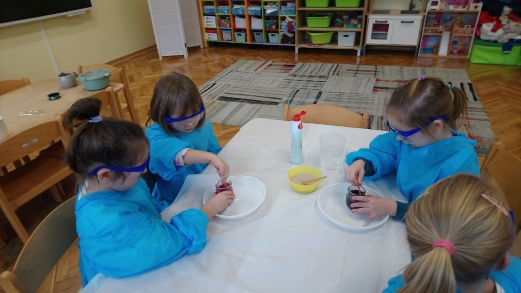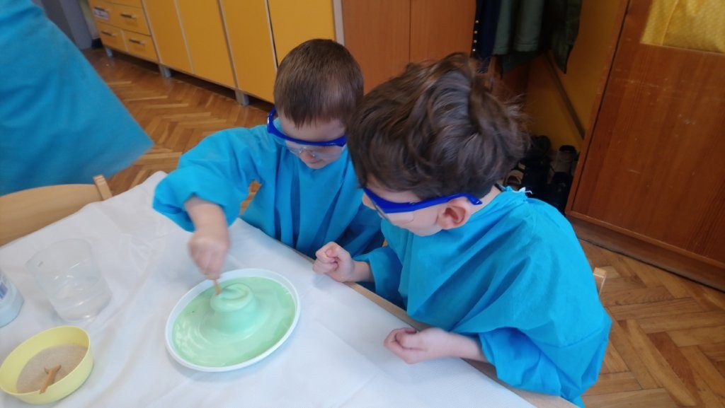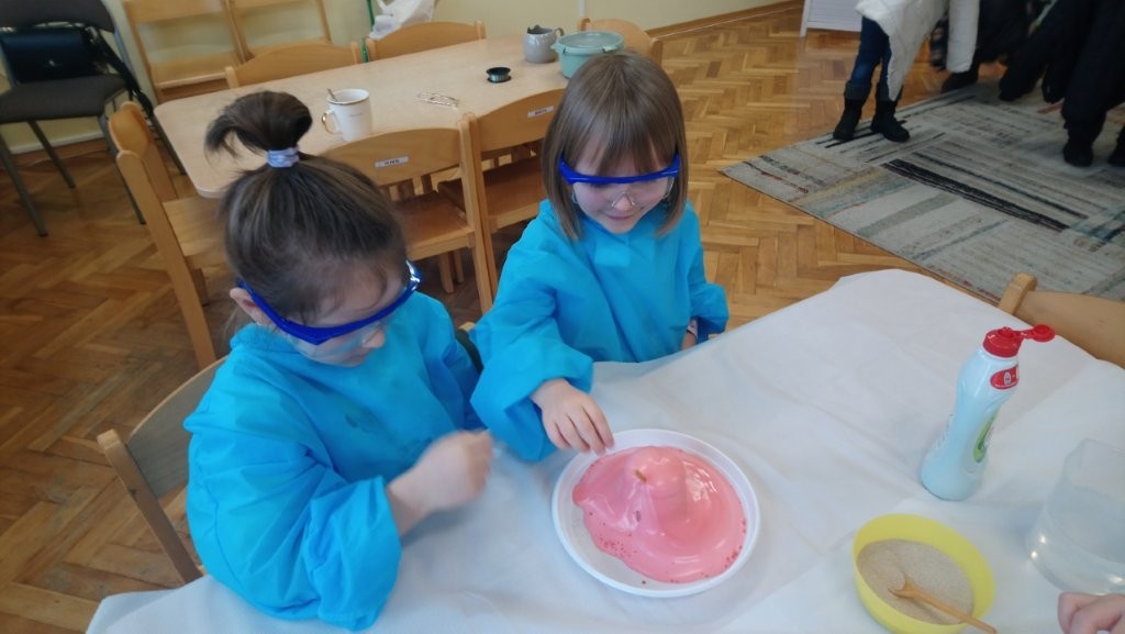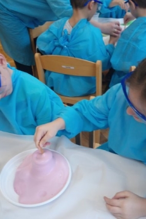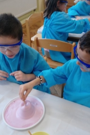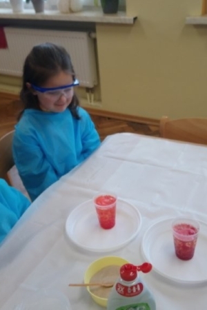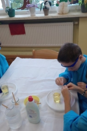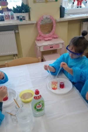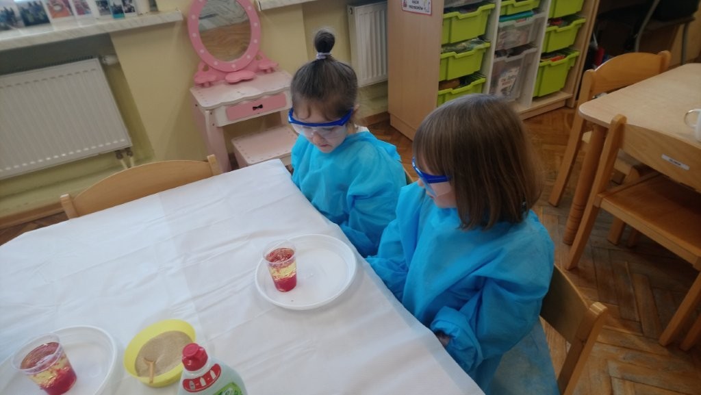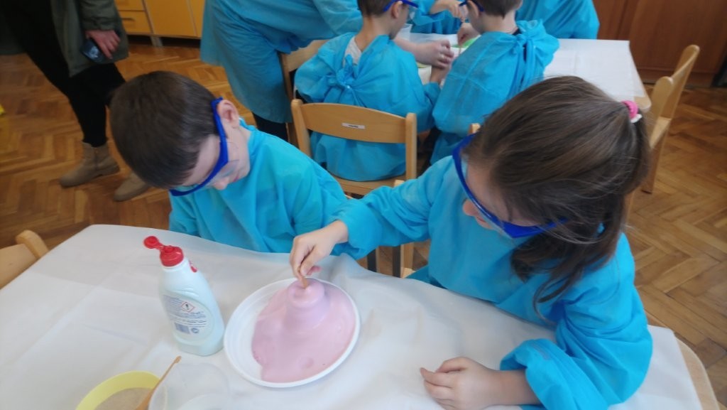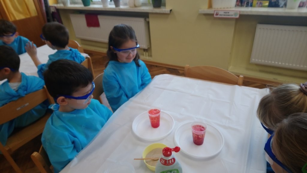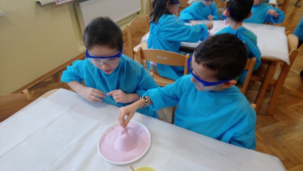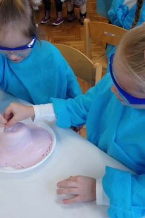 W pierwszym eksperymencie nalaliśmy olej do kubeczków, dodaliśmy wodę z kolorowym barwnikiem, a na koniec wrzuciliśmy musującą tabletkę dzięki której w naszym kubeczku coś zabulgotało i utworzył się kolorowy wir wodny. Kolejnym eksperymentem był „ Drożdżowy wulkan.” Do jego przygotowania użyliśmy suszonych drożdży wymieszanych z wodą i płynem do naczyń. Następnie zakolorowaliśmy ciecz barwnikiem a dodana woda utleniona wywołała reakcję wybuchową kolorowej piany.