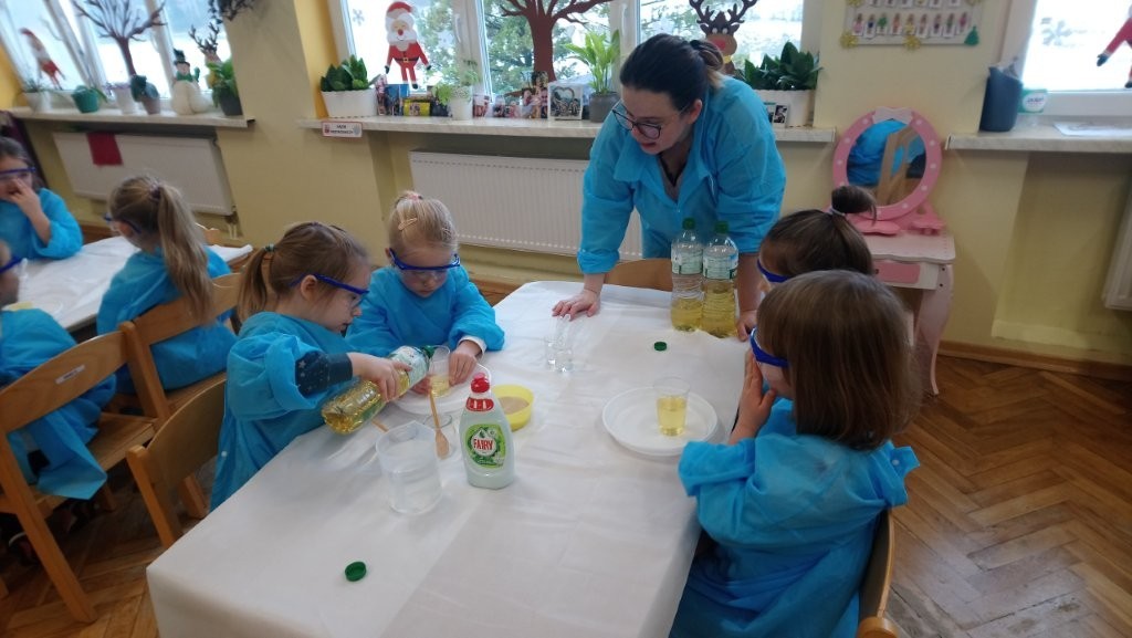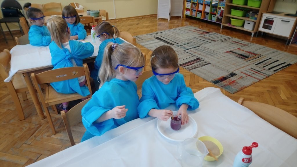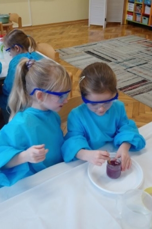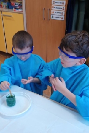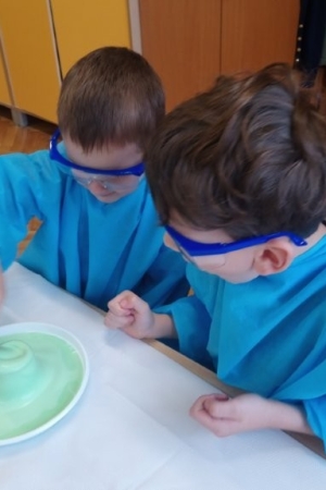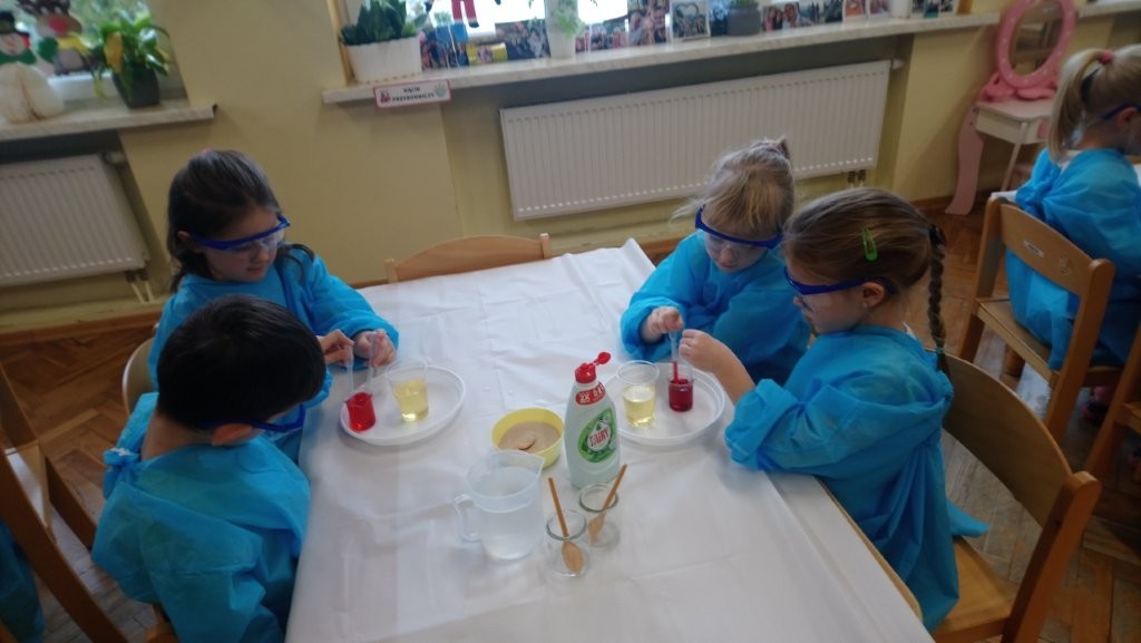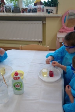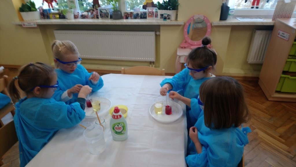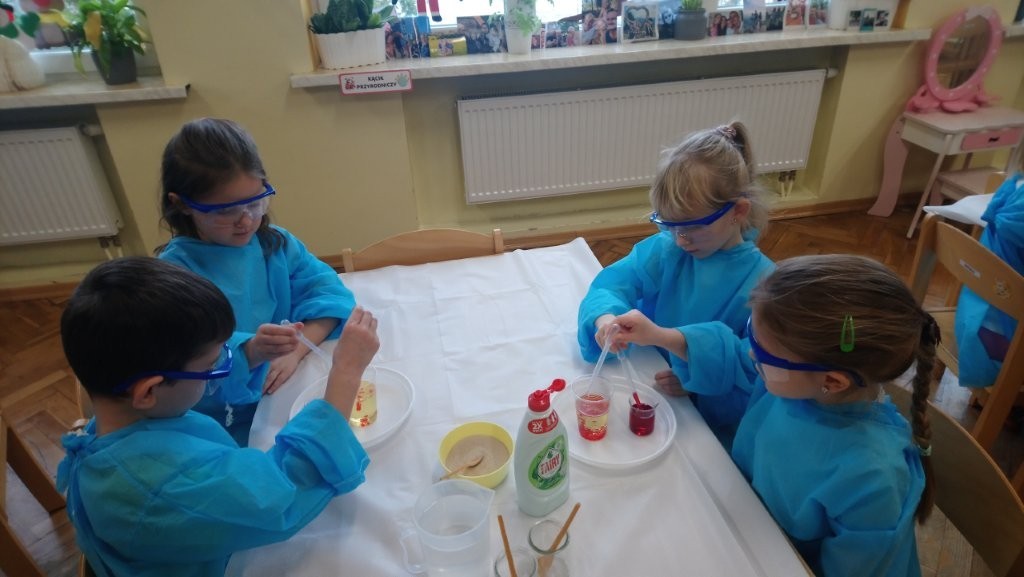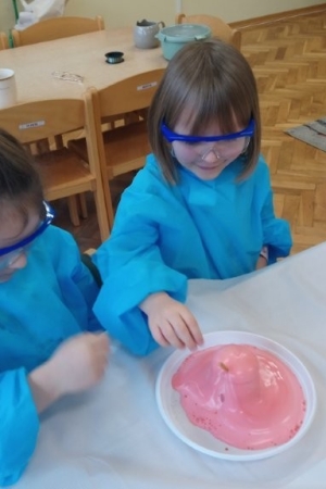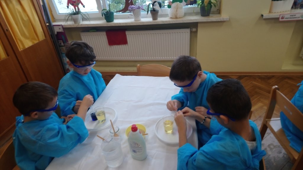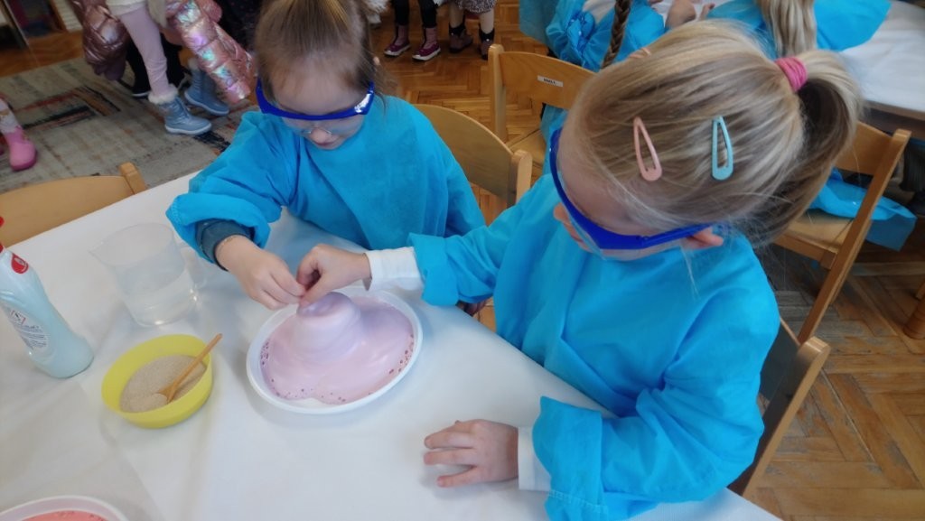 W pierwszym eksperymencie nalaliśmy olej do kubeczków, dodaliśmy wodę z kolorowym barwnikiem, a na koniec wrzuciliśmy musującą tabletkę dzięki której w naszym kubeczku coś zabulgotało i utworzył się kolorowy wir wodny. Kolejnym eksperymentem był „ Drożdżowy wulkan.” Do jego przygotowania użyliśmy suszonych drożdży wymieszanych z wodą i płynem do naczyń. Następnie zakolorowaliśmy ciecz barwnikiem a dodana woda utleniona wywołała reakcję wybuchową kolorowej piany.