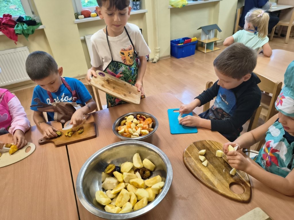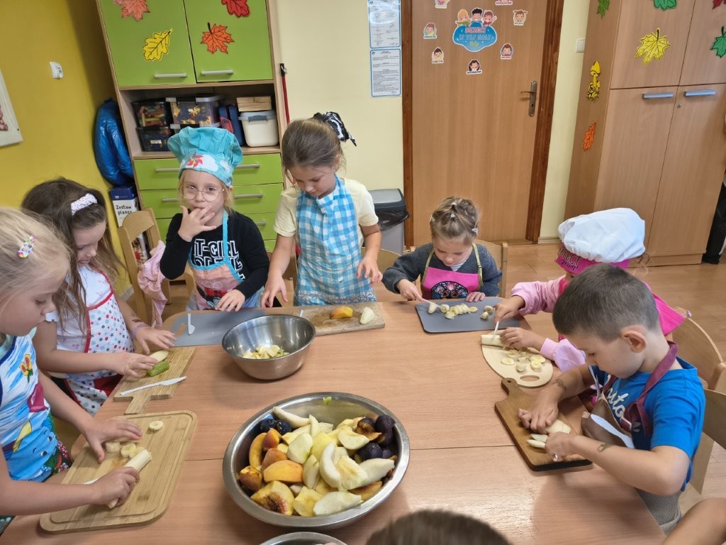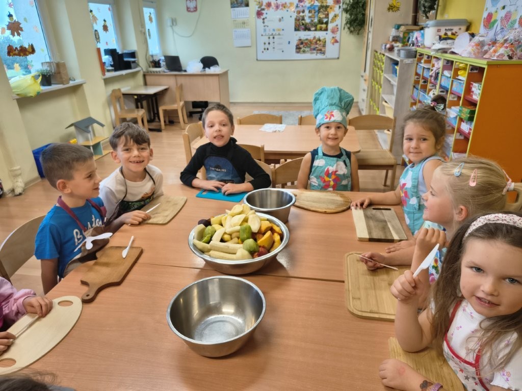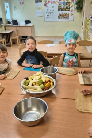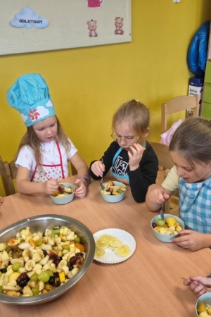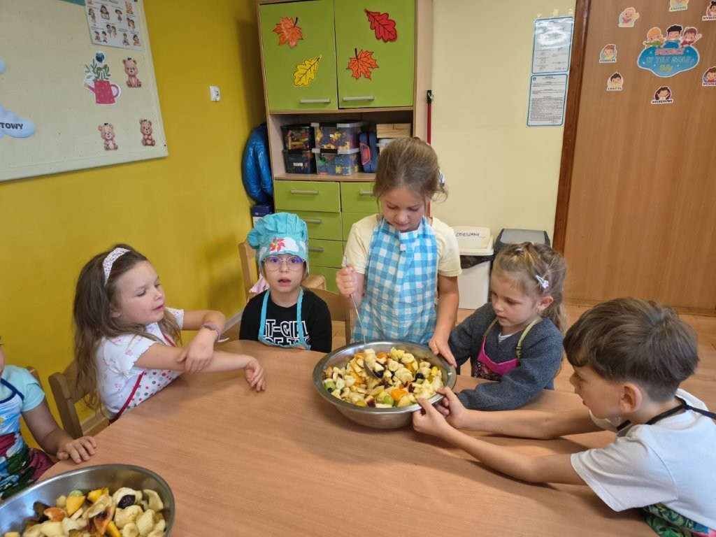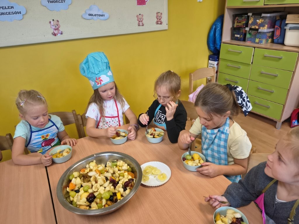 Dlatego postanowiliśmy wspólnie zrobić sałatkę owocową. Każdy przyniósł ulubione owoce i zabraliśmy się do pracy jak prawdziwi kucharze. Wszyscy pracowali krojąc owocowe przysmaki. Na koniec wymieszaliśmy owoce i była najsmaczniejsza część naszej pacy czyli degustacja.