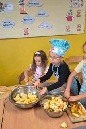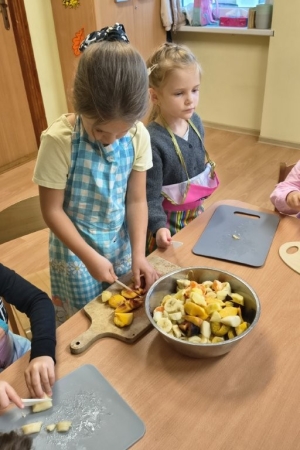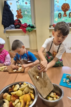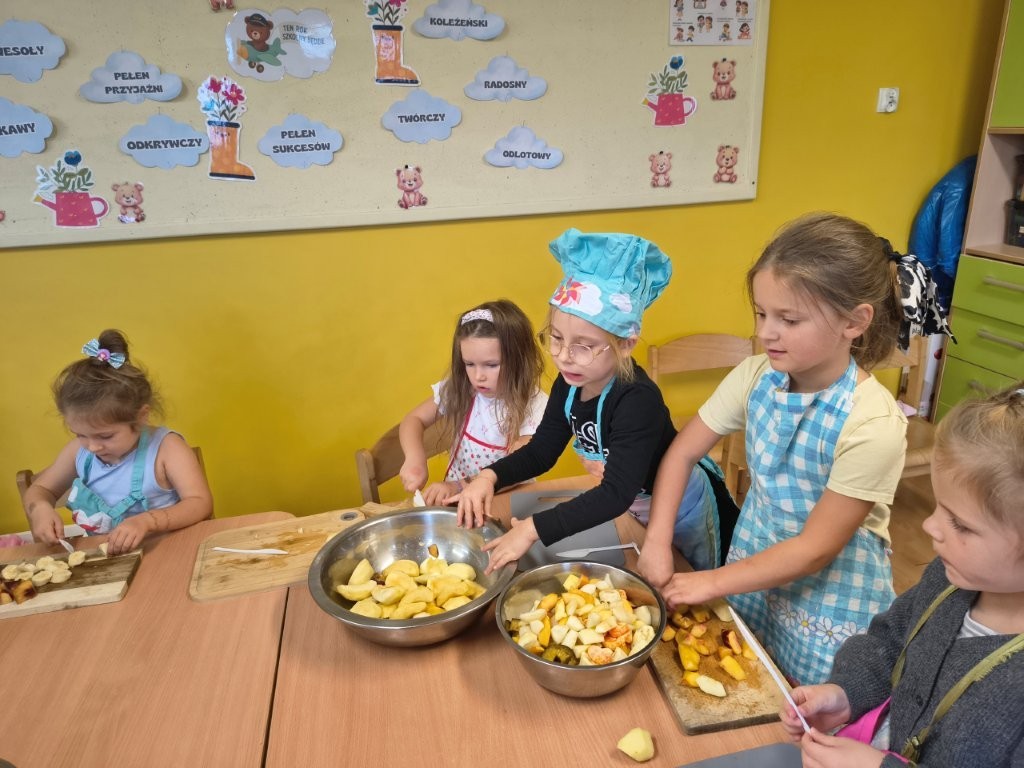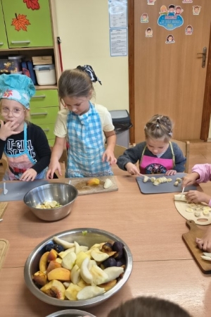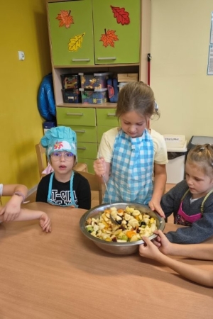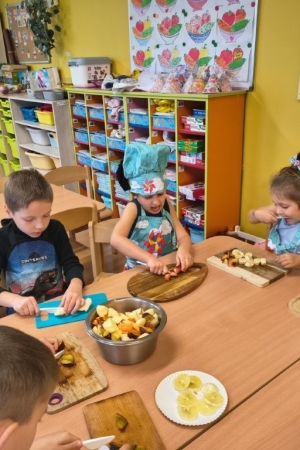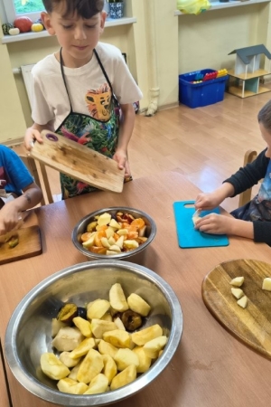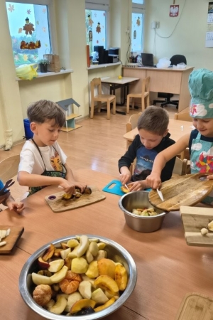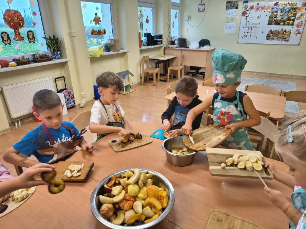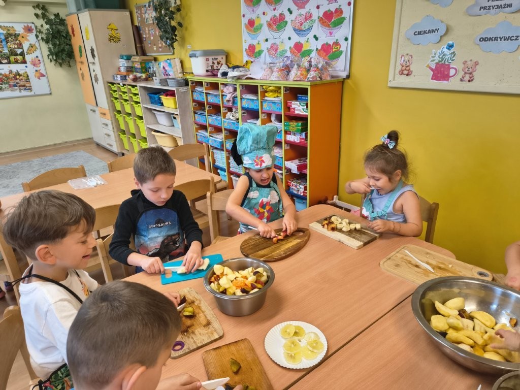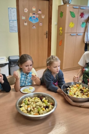 Dlatego postanowiliśmy wspólnie zrobić sałatkę owocową. Każdy przyniósł ulubione owoce i zabraliśmy się do pracy jak prawdziwi kucharze. Wszyscy pracowali krojąc owocowe przysmaki. Na koniec wymieszaliśmy owoce i była najsmaczniejsza część naszej pacy czyli degustacja.