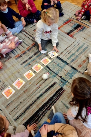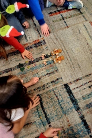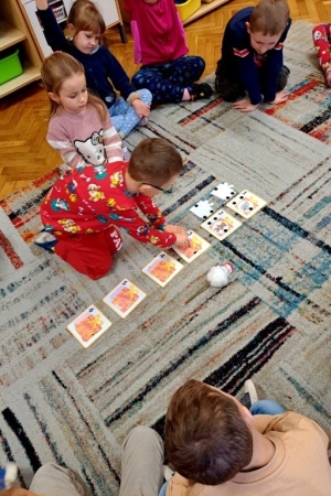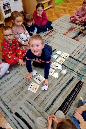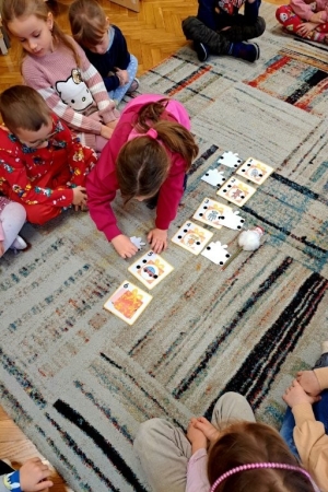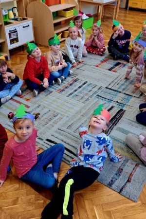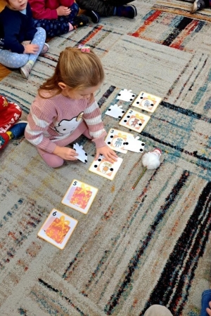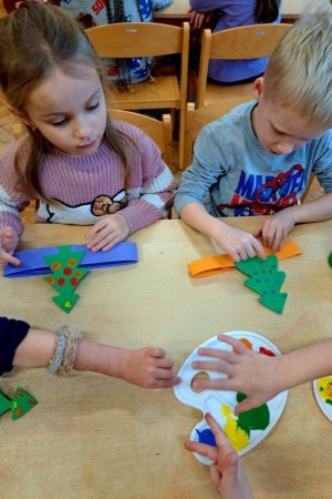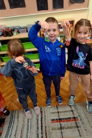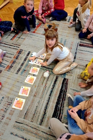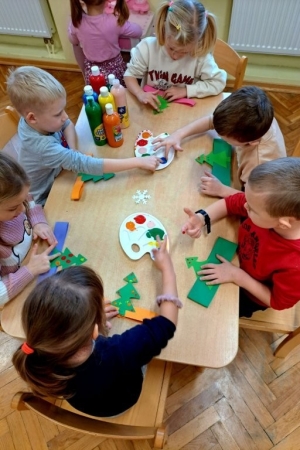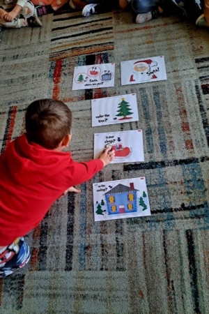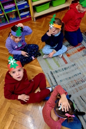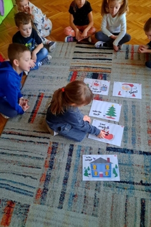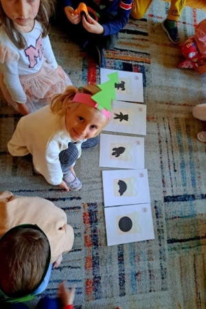 Następnie utrwalali słówka w czasie zabawy: "Jaki to prezent?" - zabawa z rymowanką i odkrywanie, co znajduje się w poszczególnych prezentach: lalka, samolot, piłka, rakieta, miś. Wszystkie liski tańczyły przy piosence "Dancing Christmas Tree" z sylwetą choinki. Ulubioną zabawą wszystkich dzieci było: "Jaki to cień?" - oświetlanie wybranej karty latarką i odgadywanie, co pokazuje cień znajdujący się w prezencie. Na zakończenie zajęć wszystkie dzieci tańczyły z płatkami śniegu przy piosence "Little Snowflake". Podsumowaniem świątecznych zabaw było stworzenie małej książeczki „Christmas”.