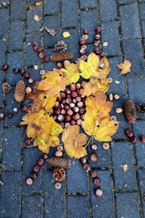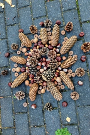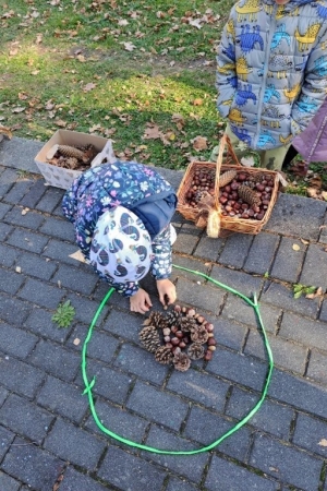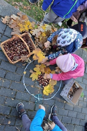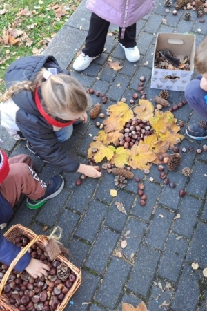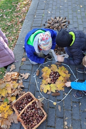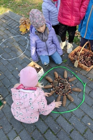 Wypełniały kształt koła - kasztanami, szyszkami, żołędziami, kapelusikami z żołędzi i kolorowymi liśćmi. Powstały dwie, duże mandale stworzone z kolorowych darów jesieni.