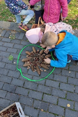 Dzieci z grupy „Lisków” zrealizowały zadanie projektowe w ogrodzie przedszkolnym. Układały według własnego pomysłu jesienne mandale.