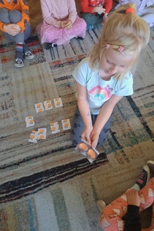 Dzieci poznały piosenkę ilustrowaną ruchem "Do You Know How Pumpkins Grow" - The Kiboomers. Następnie wszyscy chętnie grali w memory "Rozwój dyni", utrwalając nowe słówka. Kolejnym zadaniem było przeliczanie pestek w przekrojonych dyniach i układanie ich przy odpowiednich liczbach. Przedszkolaki grały w "Puk, puk/Kto tam?" - odsłaniając karty z różnymi daniami przygotowanymi z dyni. Dzieci stworzyły także małe książeczki "My Pumpkin Book".