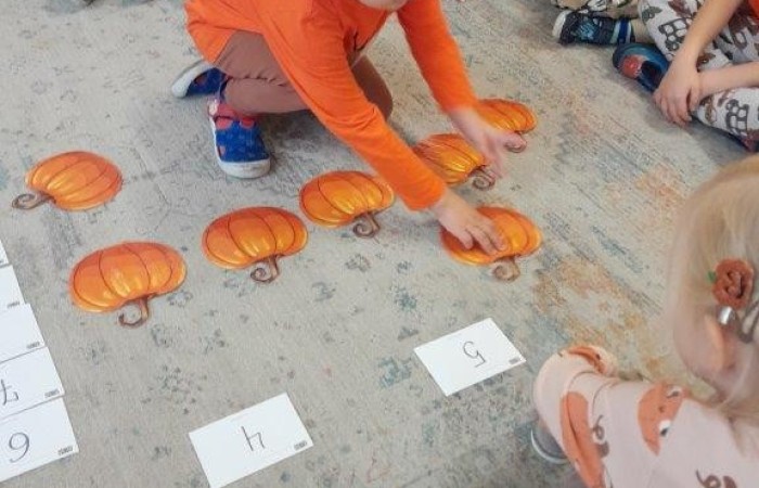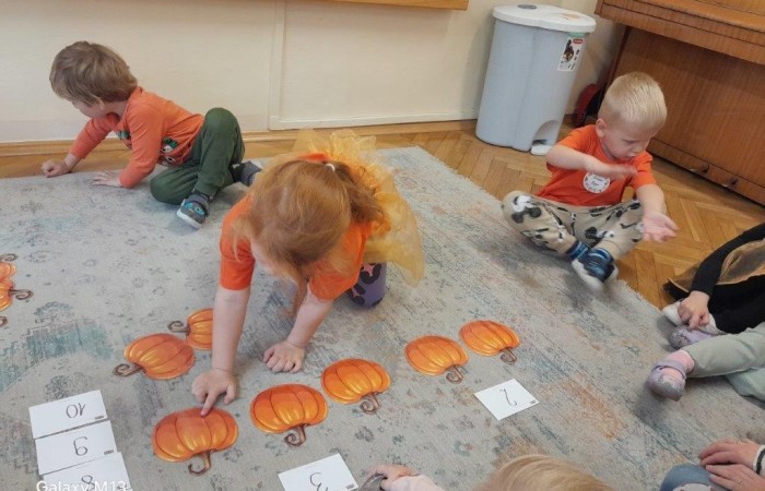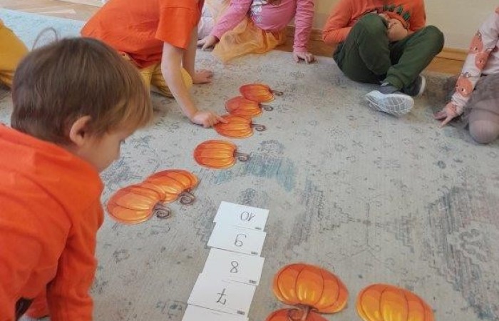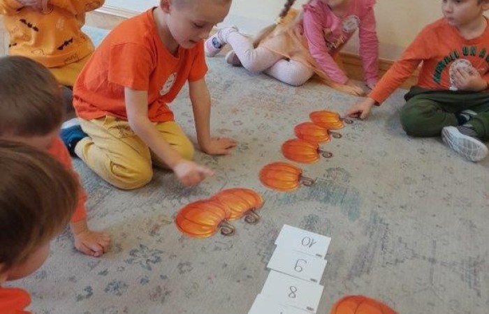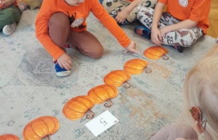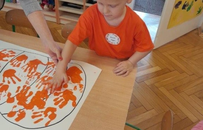 Następnie przystąpiliśmy do dyniowych zabaw: przeliczania dyń, zabawa ruchowa- „znajdź dynię” Dzieci z zapałem zabrały się również do prac plastycznych, powstałe piękne prace.